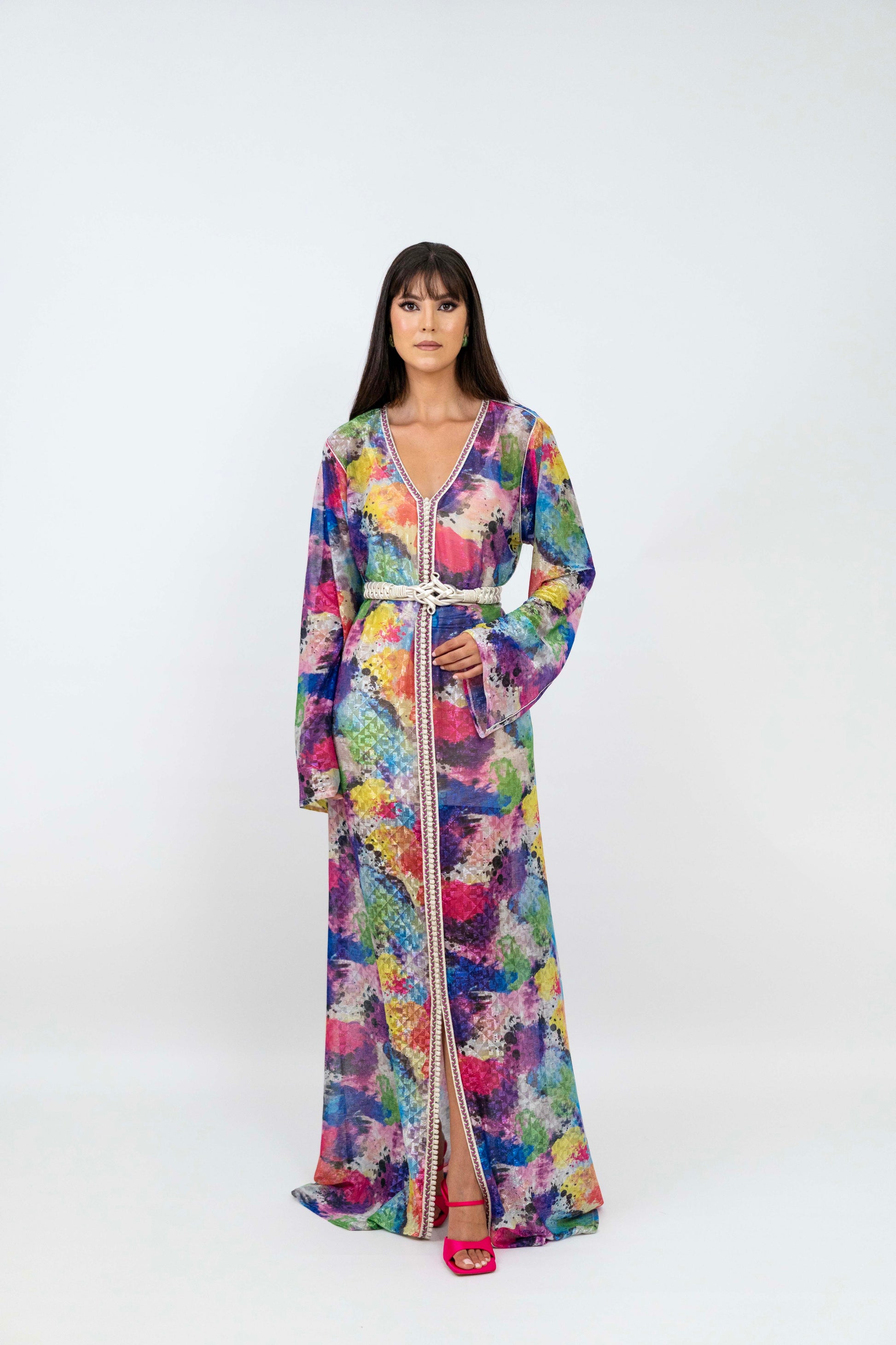 Apportez une touche de fraîcheur et d'audace à votre garde-robe avec cette robe longue aux imprimés multicolores inspirés de l'art et de la nature.