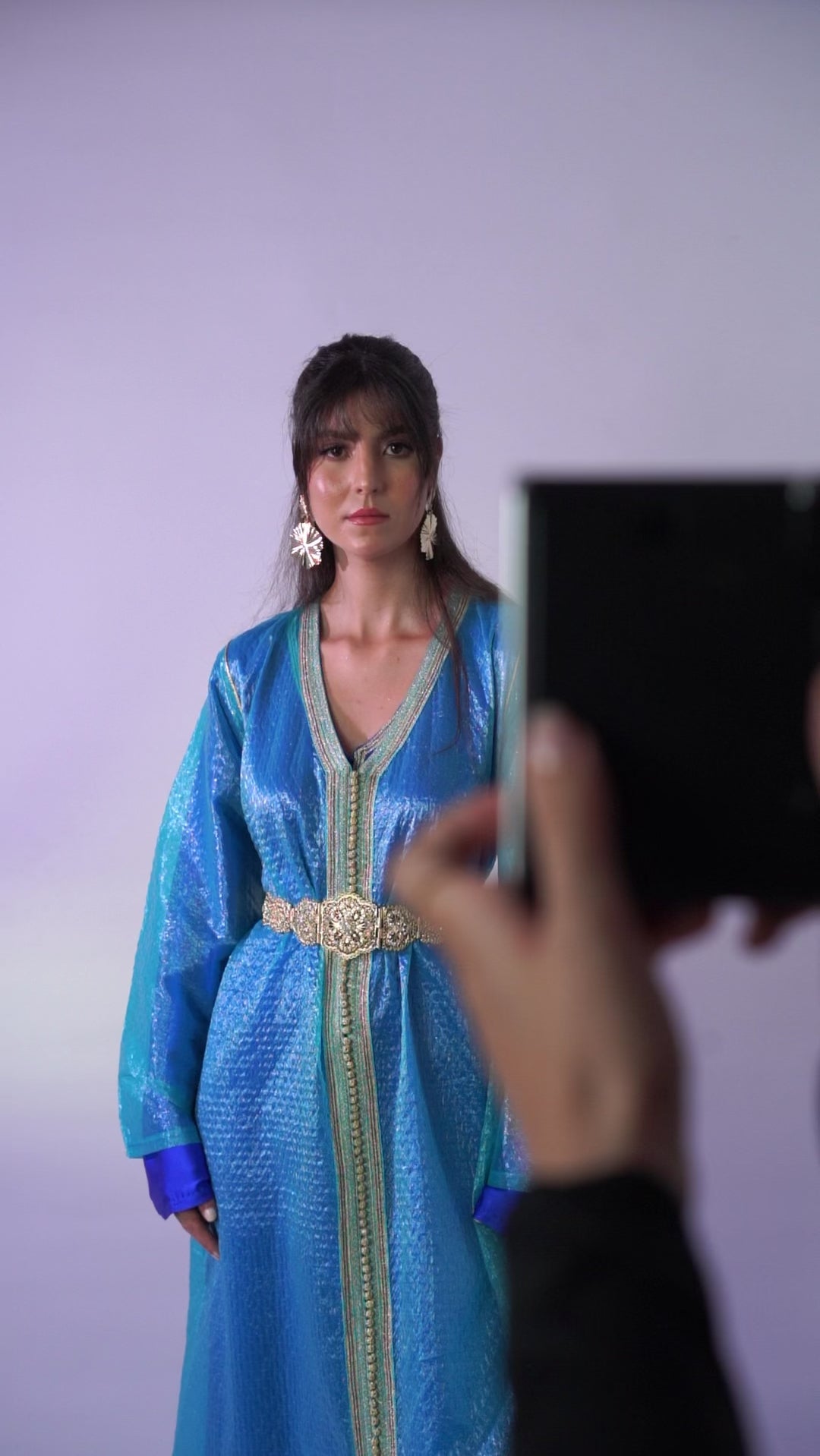 Cette somptueuse takchita en bleu ciel se distingue par sa légèreté et son raffinement. Le tissu délicatement texturé et translucide apporte une touche de modernité, tout en conservant l'élégance traditionnelle. La ceinture dorée richement travaillée marque délicatement la taille, ajoutant une note royale à l'ensemble. Le col en V et les bordures dorées soulignent subtilement les détails artisanaux de cette pièce unique. Associée à une doublure bleu électrique qui crée un contraste saisissant, cette takchita convient parfaitement pour les occasions spéciales telles que les mariages, les fiançailles ou autres célébrations.
